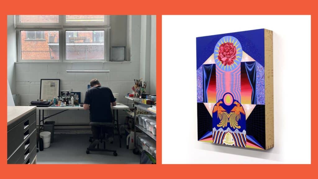 À gauche : Emmanuel travaillant dans son studio à Montréal. À droite : une œuvre de la série « Le Théâtre de la Réalité » d’Emmanuel, présentée dans le cadre de sa première exposition solo aux Pays-Bas ce mois-ci.