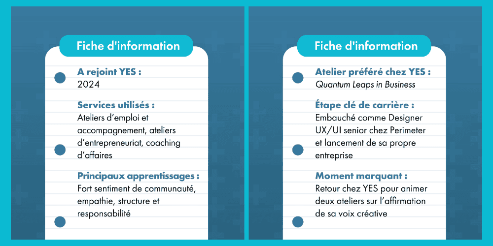 Aujourd’hui, je travaille à temps plein comme designer UX dans une agence web et numérique à Montréal. YES a joué un rôle important dans ce parcours : refaire mon portfolio, retravailler mon CV, me repositionner. Chaque atelier et chaque séance de coaching m’ont apporté quelque chose de nouveau, une amélioration de plus. Même maintenant, dans mon rôle, je repense à ces leçons. J’essaie d’apporter de la valeur avec mes compétences tout en restant ouvert à l’apprentissage que le processus apporte.