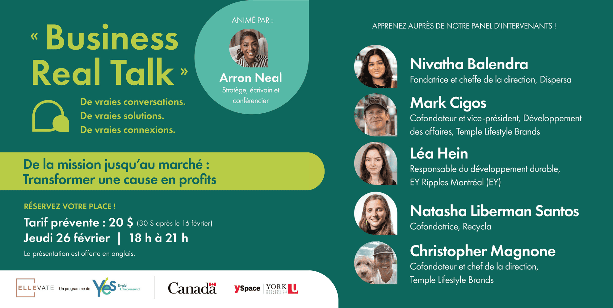 L’événement « Business Real Talk » : De la mission jusqu’au marché — Transformer une cause en profits s’adresse aux entrepreneurs qui souhaitent faire croître une entreprise engagée, tout en maintenant la rentabilité et en créant un véritable impact.