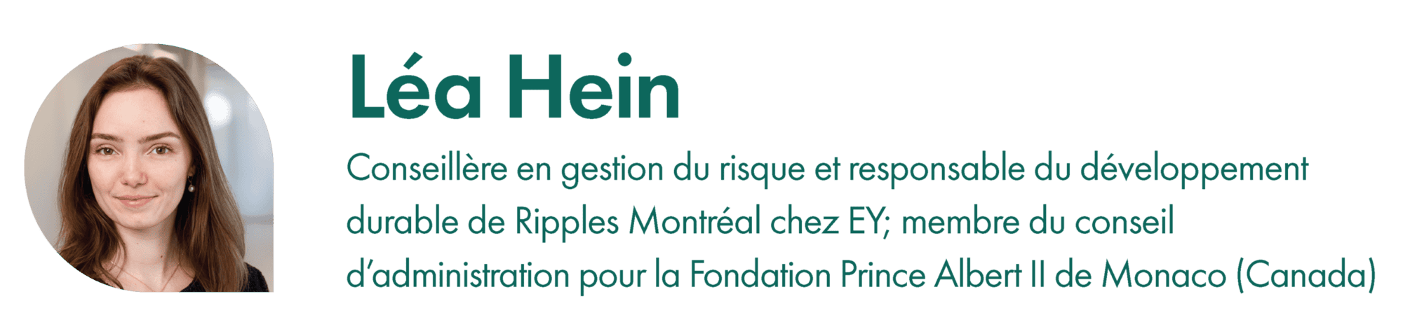 Dans sa vie professionnelle, Léa canalise cet esprit en aidant les innovateurs climatiques, les communautés et les organisations à donner vie à des idées puissantes. Son expérience touche l’investissement en technologies climatiques et son travail actuel qui soutient des initiatives environnementales par le biais de la Fondation Prince Albert II de Monaco (Canada). Chez EY, elle dirige les initiatives EY Ripples à Montréal, faisant appel au bénévolat axé sur les compétences et les opérations stratégiques sur le capital pour le progrès environnemental et social.